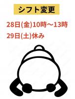 28日(金)17時~ラスト22時。 1日(月)17時~ラスト22時。 2日(火)17時~ラスト22時。 4日(木)17時~ラスト22時。 5日(金)17時~ラスト22時。